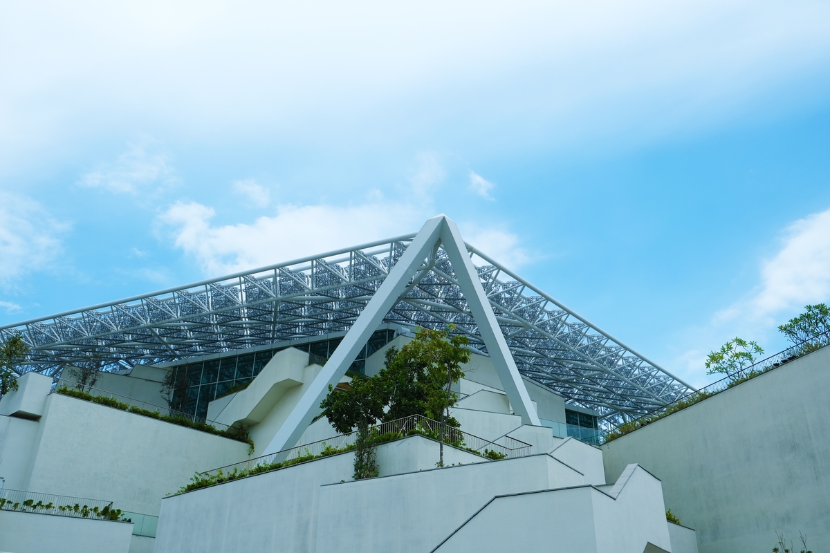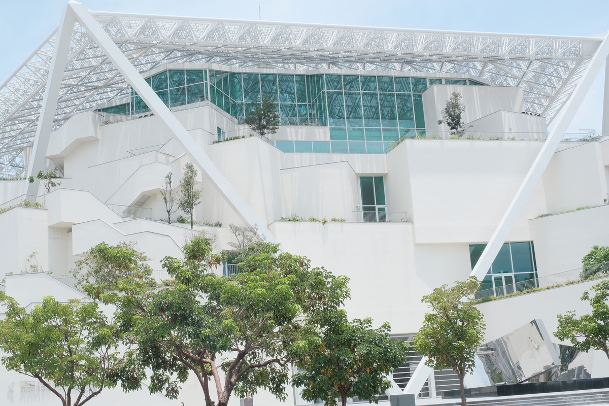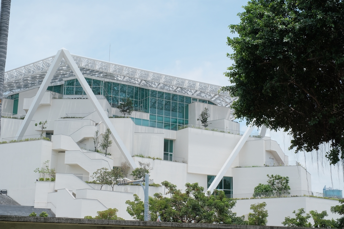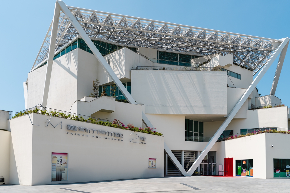 台南美術館二館的建築由日本建築師坂茂和台灣建築師石昭永共同設計,以台南的鳳凰花為靈感,將其轉化為五角形的碎形屋頂,並以垂直堆疊的白色方盒子構成,創造出充滿現代感的幾何美學。 建築特色包含利用碎形屋頂營造如樹蔭般的光影效果,以及在各樓層設計半戶外的開放平台,提供休息和欣賞城市景觀的空間。