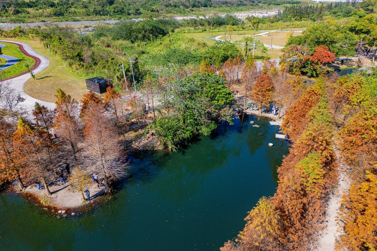 秋冬最浪漫的季節畫布,每到深秋初冬,桃園大溪的月眉落羽松秘境,總會悄悄染上一層繽紛的色彩。翠綠的枝葉漸漸轉為金黃、橘紅,再到深褐,宛如大地鋪上的油彩畫布,將整片田野妝點得夢幻而浪漫。