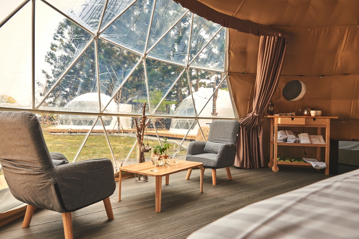 每帳依希臘神話12名神祇的特質及故事點綴,半透明的帳體,拉開窗簾便能將藍天綠地盡收眼底,每個帳篷內都有冷暖空調、獨立衛浴、免治馬桶等高端設施,露營不再只是簡單的戶外活動,而是享受五星級待遇的奢華體驗。更有專屬懶人專屬 杉中沐浴組,讓洗澡成為一場放鬆的心靈之旅