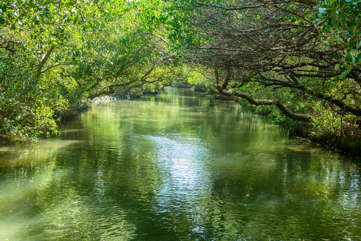 紅樹林生態,小小的招呼。乘上管筏,展開這趟綠色之旅,四周蟲鳴鳥叫為船隻的前行伴奏,綠葉隨風搖曳,踩著節奏從間隙中漏出陽光。兩旁的濕地沿岸有彈塗魚躍動、招潮蟹揮螯,相當熱鬧。