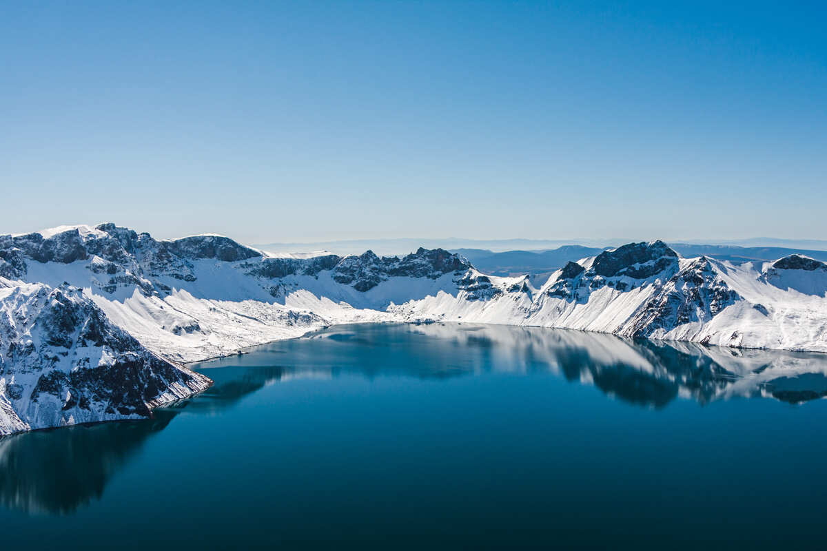 天池是火山噴發自然形成最大的火山口湖,也是松花江、圖們江、鴨綠江三江之源。因它所處的位置高,水面海拔達2150米,所以被稱為“天池”。其實在中國叫做「天池」的景點高達15座,其中長白山的這座是海拔最高,也是面積最大的。池面南北長4400公尺,東西寬3370公尺,平均水深204公尺,池水四周環繞著許多奇怪的石柱,色澤異常詭麗,是一種不真實的藍,從湛藍到粉藍,偶爾,又像是土耳其玉藍。