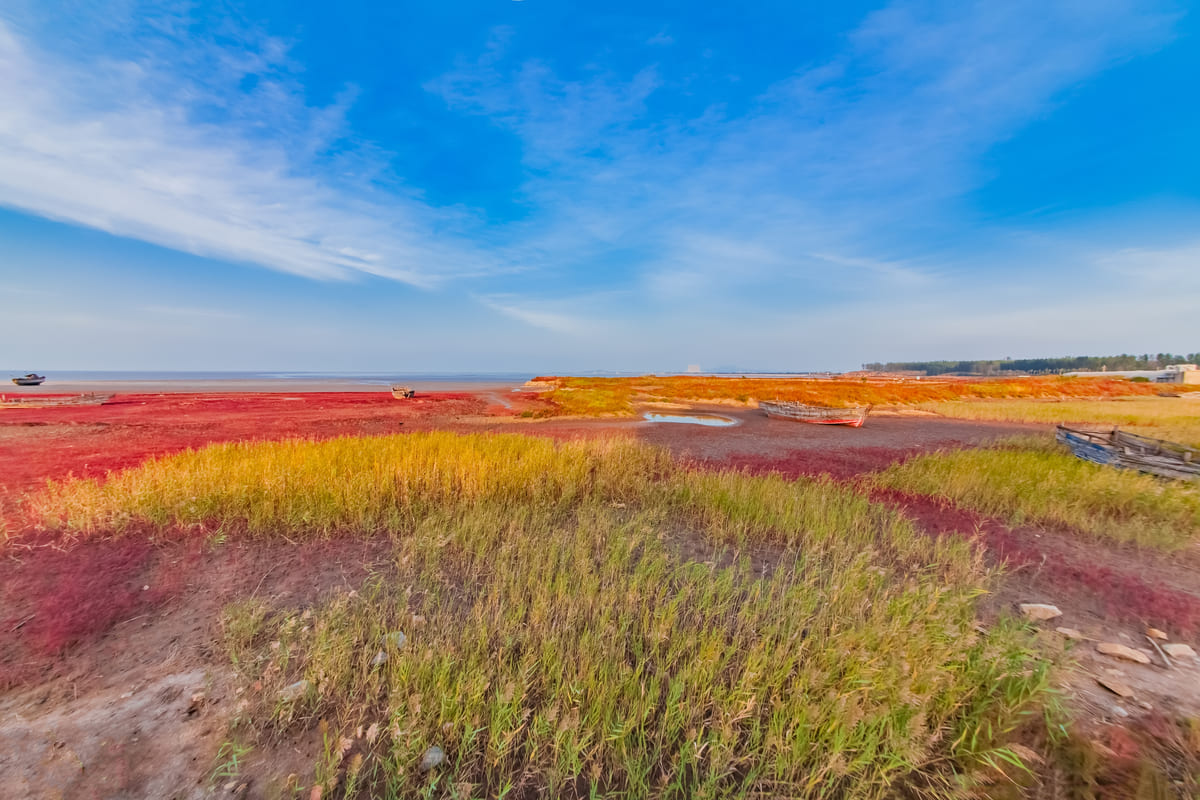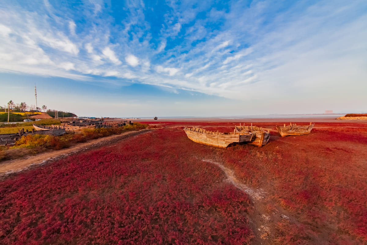 紅海灘地處遼河三角洲濕地,位於盤錦市西南海濱,是由大片紅色的鹼蓬草形成的著名濕地。紅海灘國家風景廊道是紅海灘面積最大的景區,在這裡你可以漫步於木棧道、看紅如熾焰的鹼蓬草在海岸線上無限延伸,而紅海灘遠處的油井在夕陽下更是一副迷人的畫卷。秋天來此還能看到金黃色的稻田與紅海灘相呼應,以及成群的候鳥展翅於灘涂的深處。