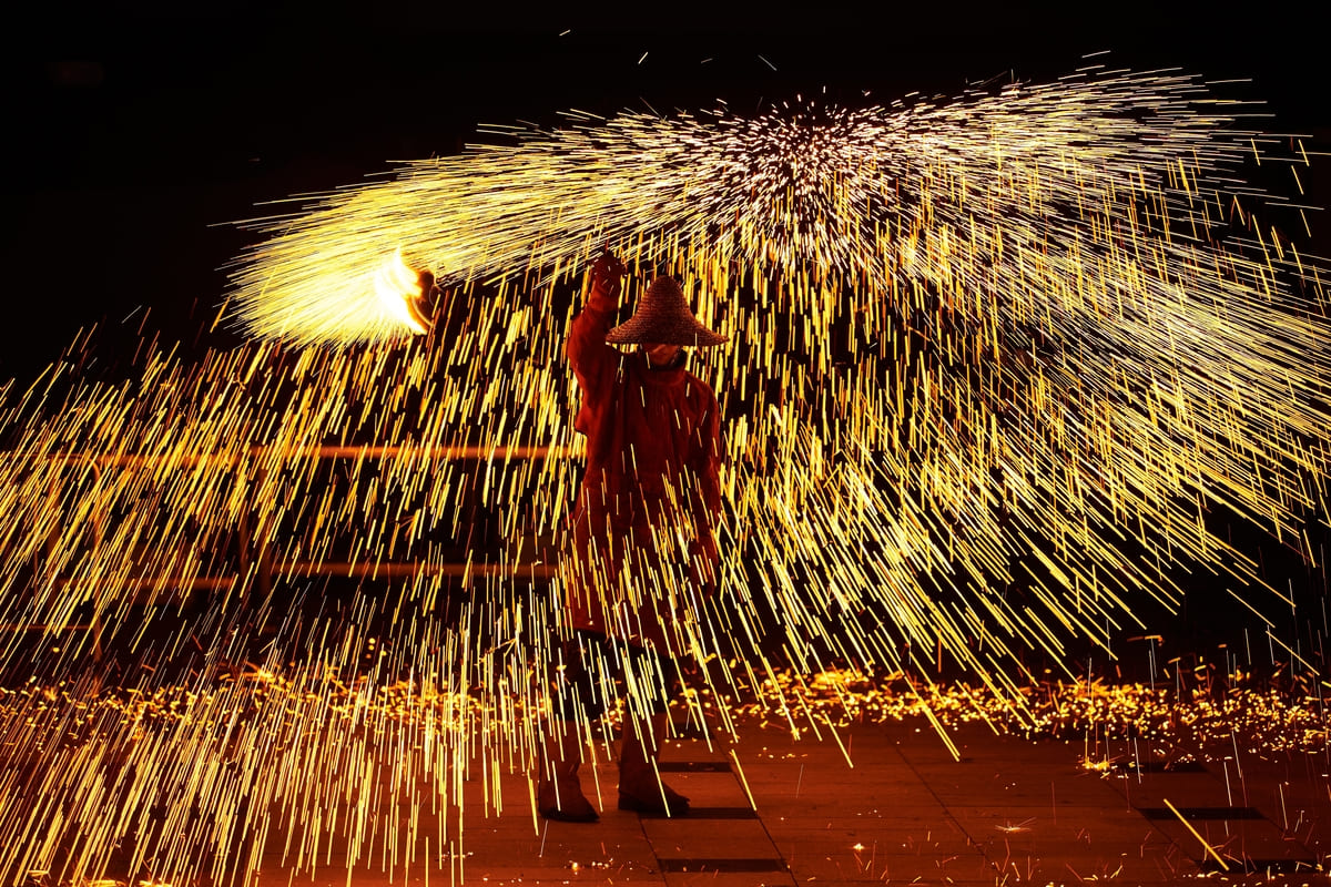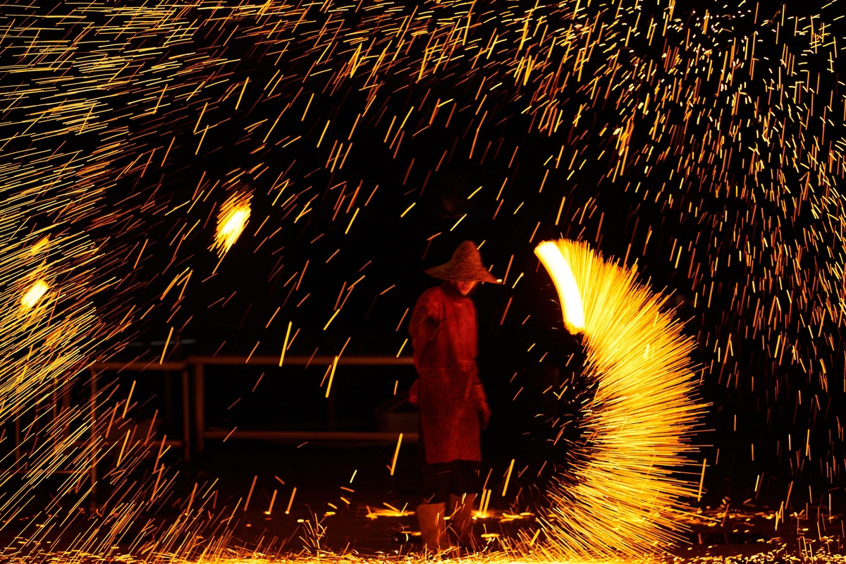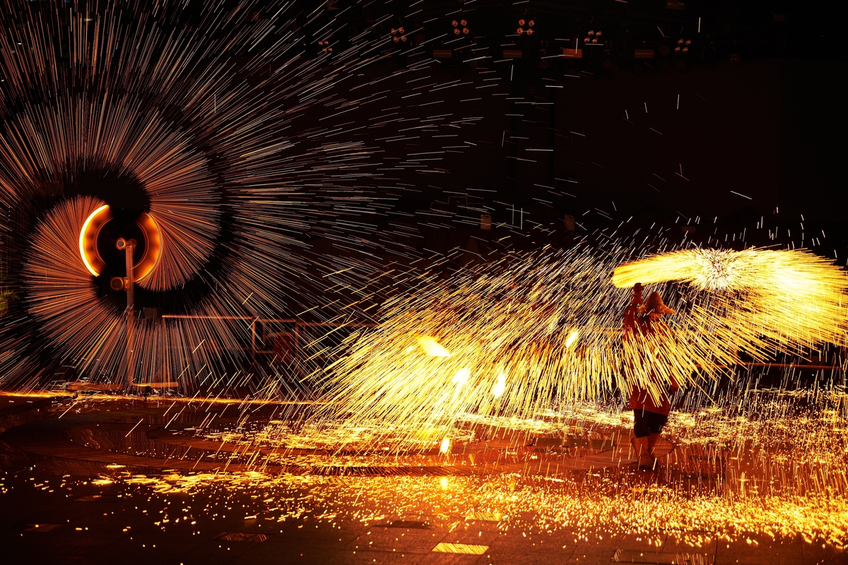 是婺女洲度假區的“重頭戲”, “鐵樹銀花落,萬點星辰開”時激動人心的場面。當1600°的鐵水經花棒擊打,在高空綻放,就如同一場星雨灑落在眼前,浪漫至極,只能用“驚豔”兩個字來形容。