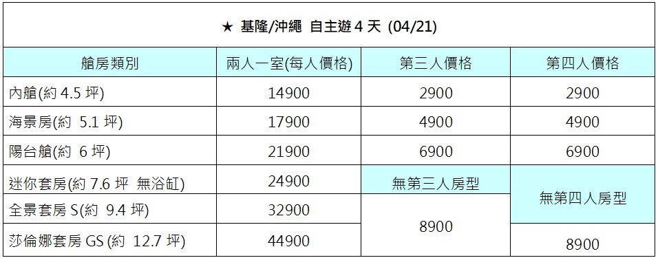 1、優惠限定航次:4/6、4/13、4/21 出發航次。
