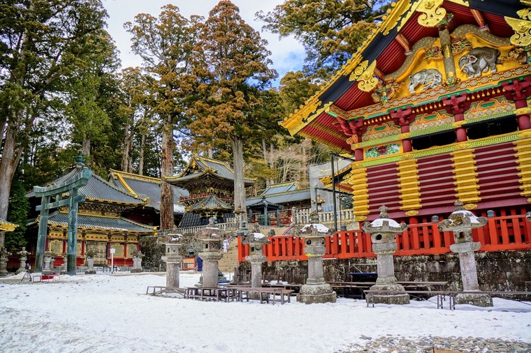 德川幕府第一代將軍徳川家康的家廟,建築精雕細刻,金碧輝黃,日本風格的明陽門和中國風格的唐門是其代表建築,豐富的歷史古蹟,使日光東照宮在1999年被列入《世界文化遺產》,供奉神馬的「神廄舍」,舍內養著一匹雪白駿馬,日本人認為馬是神明的坐駕,代表著神聖,在神廄上的三猿雕刻更是此地代表,非禮勿視、非禮勿聽、非禮勿言的3隻猴子像,傳神的表達出其意思,除了三之猿猴,還有著眠貓像,以閉目養神、豎著耳朵的貓咪警惕後輩即使盛世太平,也要居安思危;眠貓背後有麻雀圖騰呼應,藉貓、雀和平共處,喻江戶時期的和諧。
