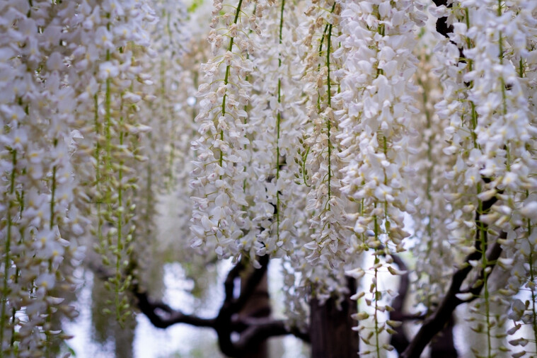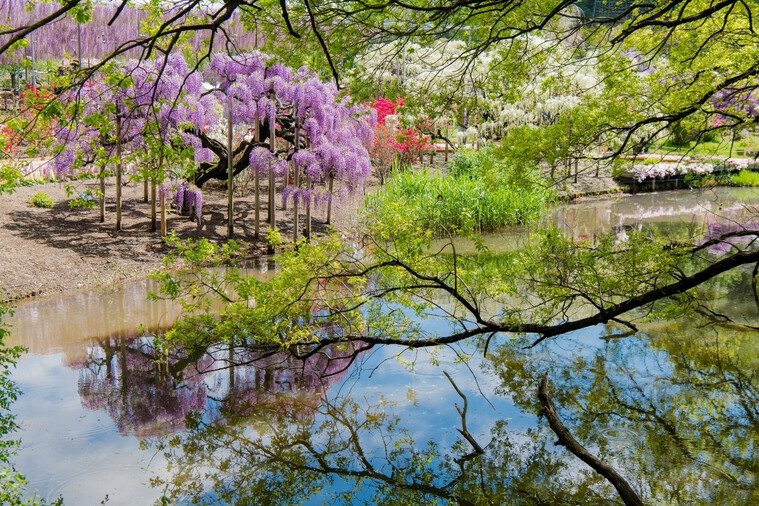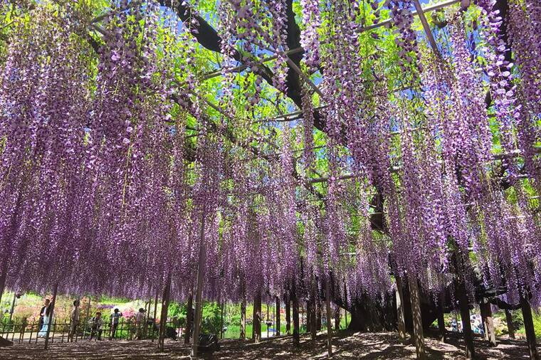 【足利市花卉公園】有「花的藝術村」之稱。每到春季,整座公園彷彿被彩色花海包圍。 紫藤是園區最具代表的花卉,花期約在每年 4 月中旬至 5 月中旬。園內約有300株紫藤樹,盛開時花量之大,宛如一條條紫色瀑布垂落,景象壯觀,令人屏息。最受矚目的 大藤、白藤通道與八重黑龍大藤 中,「大藤」是園區的招牌,共有3株,樹齡超過130年,垂掛的花穗猶如瀑布傾瀉,美得震撼人心。紫藤花隨品種不同依序綻放,最早是 4 月中旬的淡粉紅藤,接著是紫藤,再來是白藤,最後由 5 月初的黃藤為整年花季畫下完美句點。