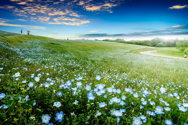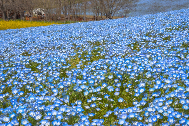 【常陸海濱公園】每年 4 月下旬到 5 月中旬,數以百萬株粉蝶花盛開,將整片廣闊山丘染成湛藍,遠遠望去,花海、天空與太平洋的海色交織成壯麗一體,讓人彷彿置身藍色的夢境之中,是一生至少要親眼目睹一次的奇蹟景致。除了粉蝶花,這裡更是日本數一數二的花卉主題公園。四月到五月,金黃油菜花與色彩繽紛的鬱金香相繼盛放,與藍色粉蝶花相互輝映,勾勒出最動人的春日花之物語。