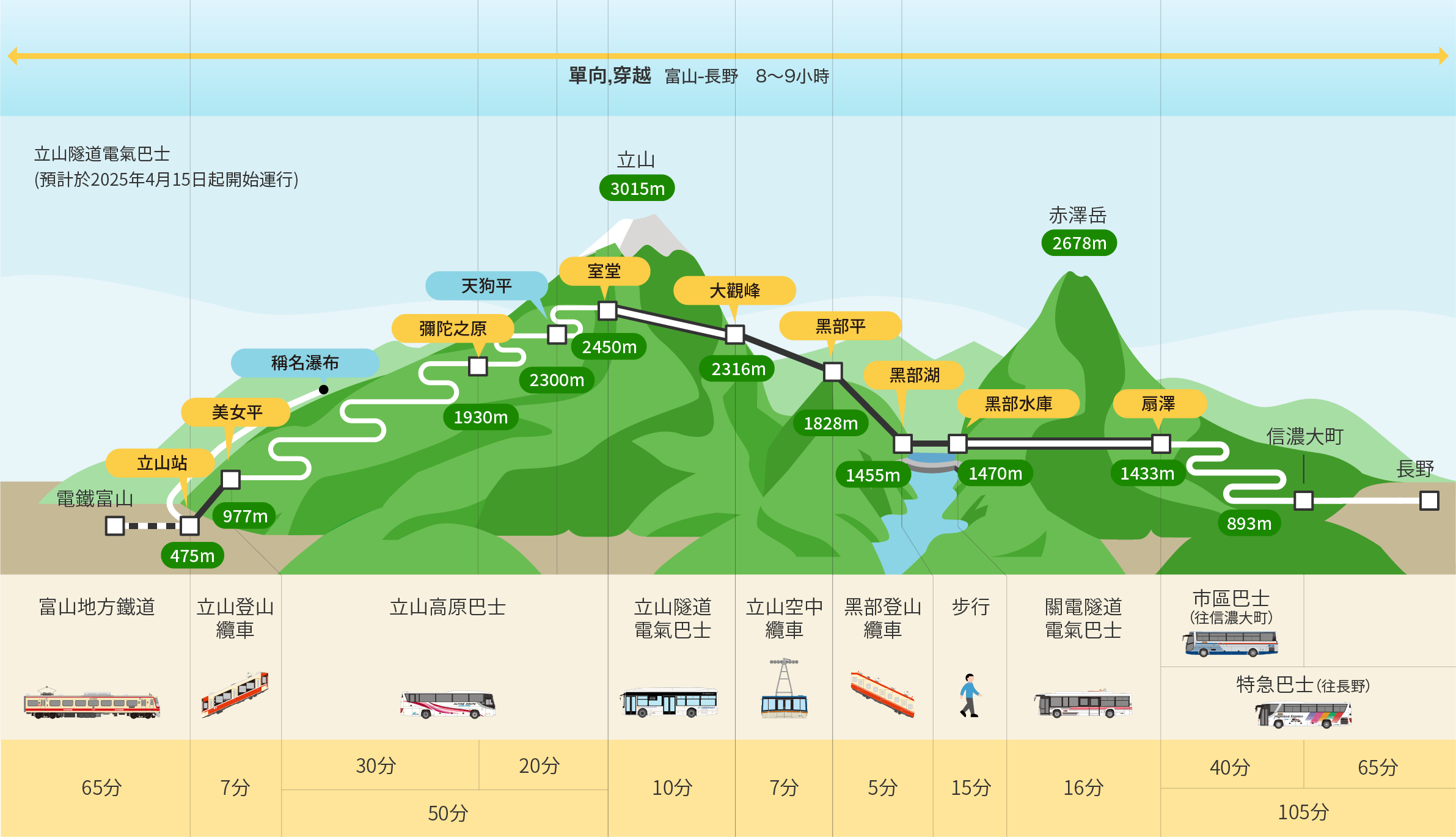 2.立山車站~美女平車站之索道若遇客滿,屆時可能改以巴士替代。